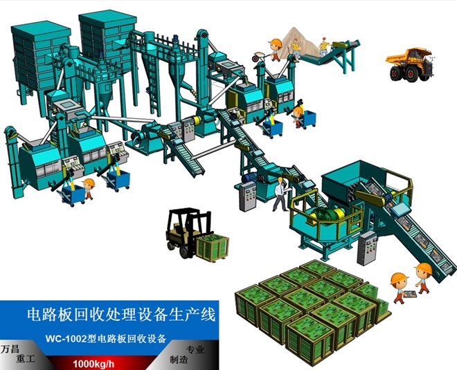廢舊電路板是玻璃纖維強(qiáng)化樹脂和多種金屬的混合物,屬典型的電子廢棄物。線路板中的金屬品位相當(dāng)于普通礦物中金屬品位的幾十位至上百位,金屬的含量高達(dá)40%,最多的是銅,此外還有金、鋁、鎳、鉛、硅金屬等,其中不乏稀有金屬;而自然界中的富礦金屬含量也不過3%~5%。如果不妥善處理與處置,不但會造成有用資源的大量流失,而且其所含有鎘和溴化阻燃劑等大量致畸、致突變、致癌物質(zhì),會對環(huán)境和人類健康產(chǎn)生嚴(yán)重的危害。為此萬昌特別生產(chǎn)制造了一種適合我國國情的高環(huán)保、高效率的全自動化回收處理廢棄電路板生產(chǎn)線。